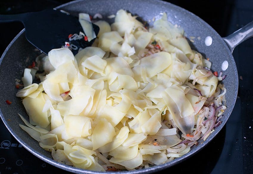 - Turn up the heat slightly, then add the potato slices to the pan. Mix all the ingredients thoroughly, then season well with freshly ground sea salt and black pepper. Add the fresh thyme (leaves and thin stalks are fine), then keep stirring through for a few more minutes.