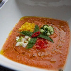 The very first time I made Gazpacho soup was when I was visiting my sister who was living in a small village of Vilcabamba, near Loca in Ecuador. The required ingredients were cheap, plentiful, locally produced and so fresh. Ecuador certainly opened up my eyes (and palette) to some amazing local flavours and recipes, some I would not readily repeat (Guinea pig springs to mind). One thing I certainly learned about culture, food, and the attitude to them – one country’s domestic pet is another country’s speciality dish. We live and learn, or at least I do. The other ingredient I will gladly never eat again is the starchy root of the Yucca plant.