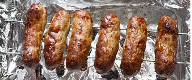 The sausages have been skewered and suspended above the base of a foil lined tray so that the fat drips out of the meat.